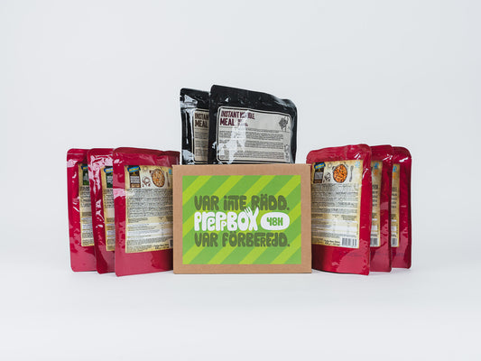 A disaster box with crisis food from swedish Preppbox is insurance against hunger if the crisis comes. The boxes contain good, nutritionally calculated Meals Ready-to-Eat with a long guaranteed shelf life of at least two years (up to 25 years!) that fit perfectly in a standard wardrobe. We call it the disaster box because that's when it should be used: if the disaster or crisis comes and you no longer have access to food as usual.