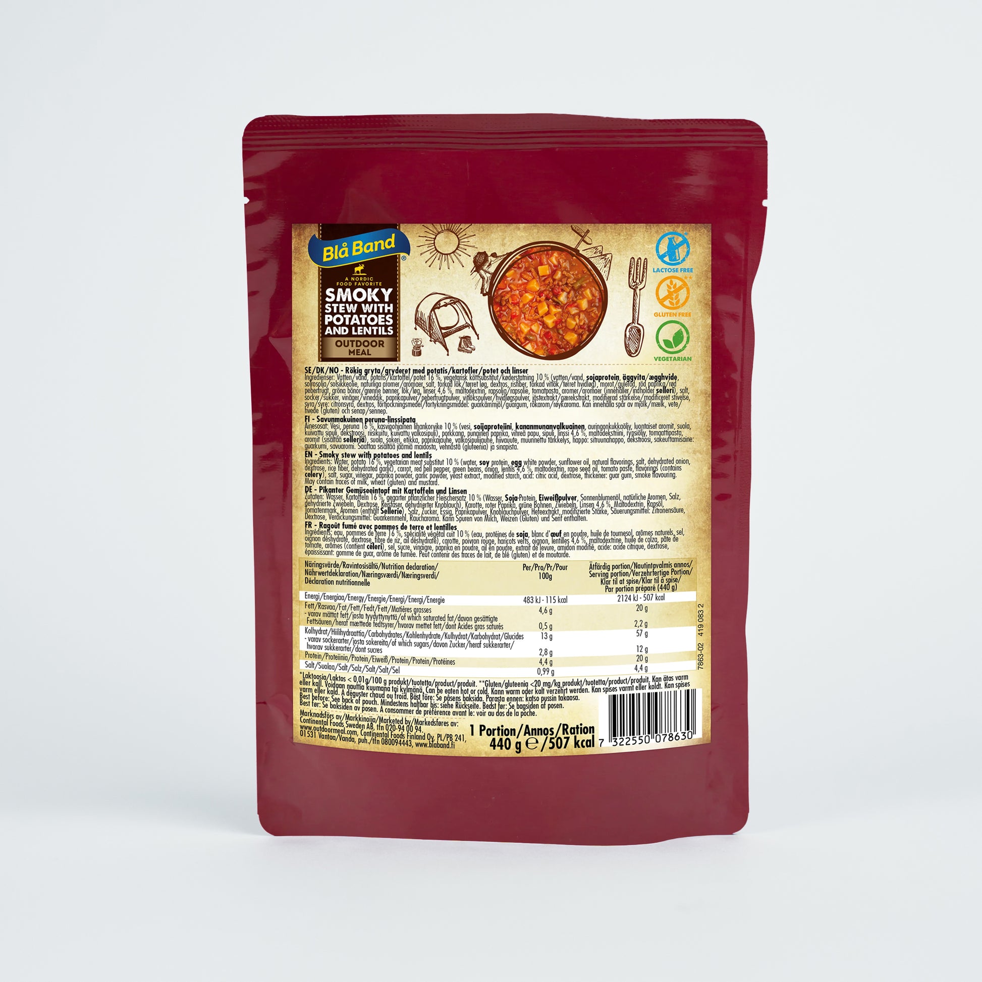 Blå Band Rökig Gryta med Linser är en vegetarisk portionsrätt. Den tillagas och äts direkt ur påsen, utan att behöva tillsätta vatten.